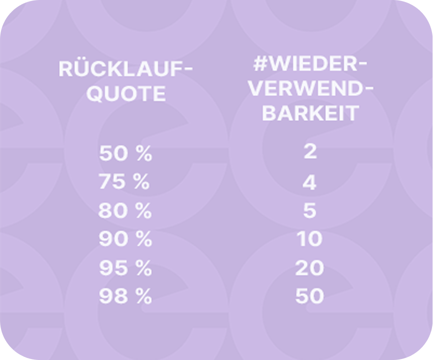 Einmal herstellen, maximal wiederverwenden = ein Mal Herstellungskosten, danach “nur noch” Sammel- und Servicekosten. Aus diesem Grund ist die Rücklaufquote (Rq) nicht nur ökologisch sondern auch ökonomisch entscheidend: Je höher die Rücklaufquote, desto produktiver die Verpackung. Je schneller der Umlauf, desto schneller die erneute Berechnung der Dienstleistung.